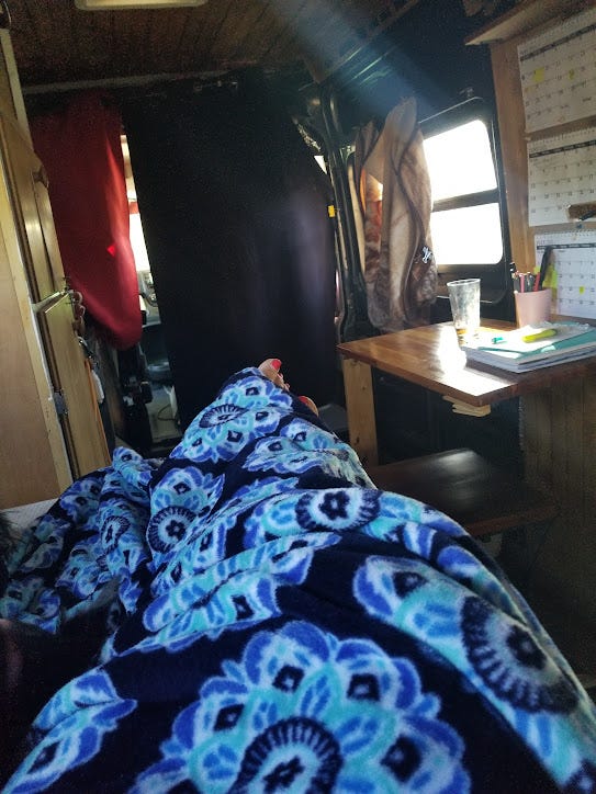 Here is a picture taken of my home taken 4 months ago. I’ve lived in this same spot since March 14, 2022 and I love it. I sleep, eat, write, cook, talk on the phone, in 75 square feet. My homemade 6” memory foam mattress is where I write every morning in my journal, make my daily to do lists, and get educated on you-tube tutorials.